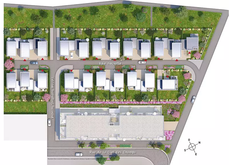 D’architecture sobre et intemporelle, la réalisation s’organise de part et d’autre de la rue de la Clef des Champs, dans un environnement calme et naturel.