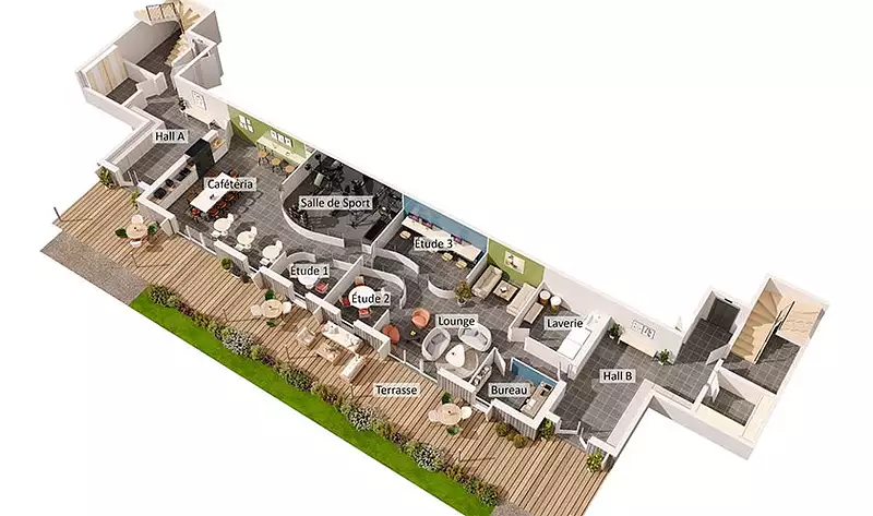 Des espaces et services partagés : présence quotidienne d’un régisseur, cafétéria, laverie, salle de sport et salle de coworking
