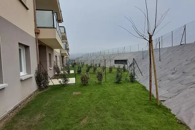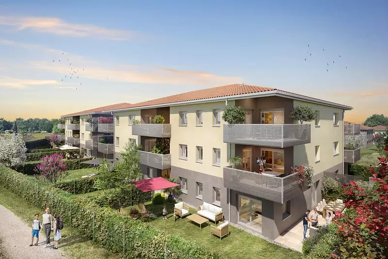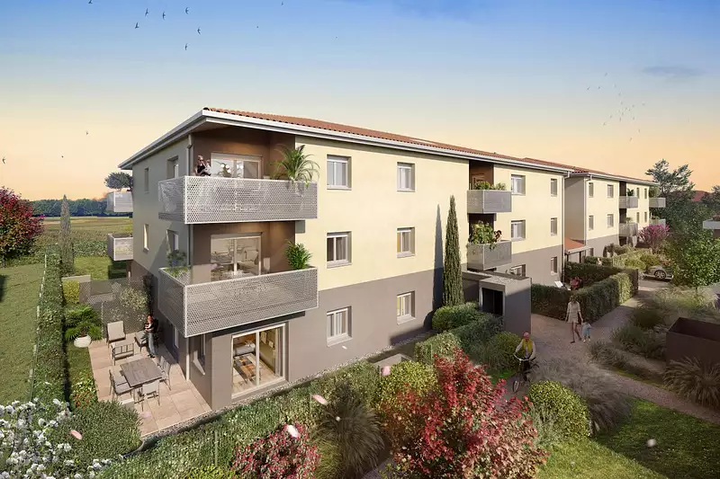 Entouré en partie de terres agricoles, ce programme est constitué de 2 bâtiments de 2 étages et vous propose des appartements T3 et T4 en rez-de-jardin à partir de 185 000 €* seulement !