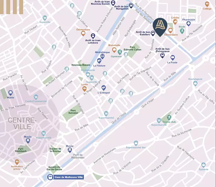 Découvrez votre future adresse "Les Bateliers" à Mulhouse, une ville riche en patrimoine culturel et historique nichée au cœur de l'Alsace et proche des frontières suisse et allemande.
