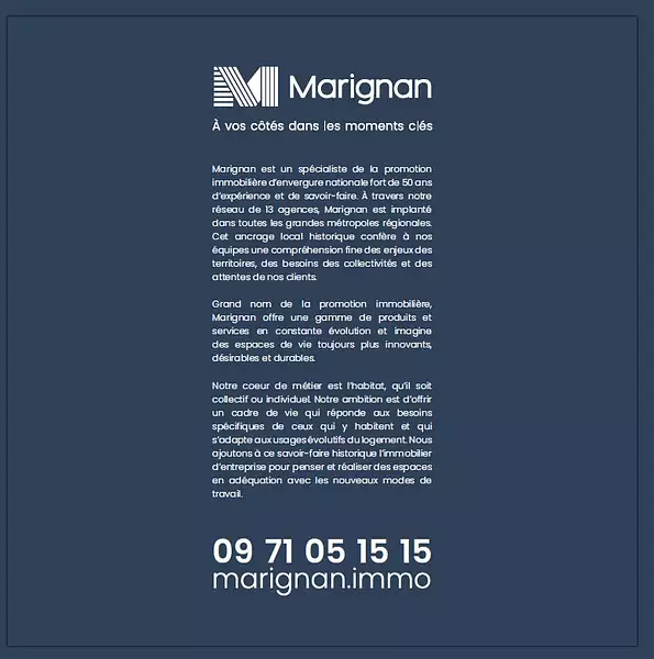 Les frais de notaire sont offerts hors frais éventuels liés à l’emprunt et hors frais d’hypothèque, de caution de privilège de préteurs de deniers ou de tout autre frais éventuel de garantie lié au financement de l’acquisition. Offre valable pour la signature d’un contrat de réservation pour la résidence "Les Bateliers" à Mulhouse entre les 15/01/2026 et 28/02/2026, sous réserve de la signature de l’acte dans les délais stipulés au contrat de réservation, dans la limite des stocks disponibles et non cumulable avec toute autre offre Marignan en cours et à venir.