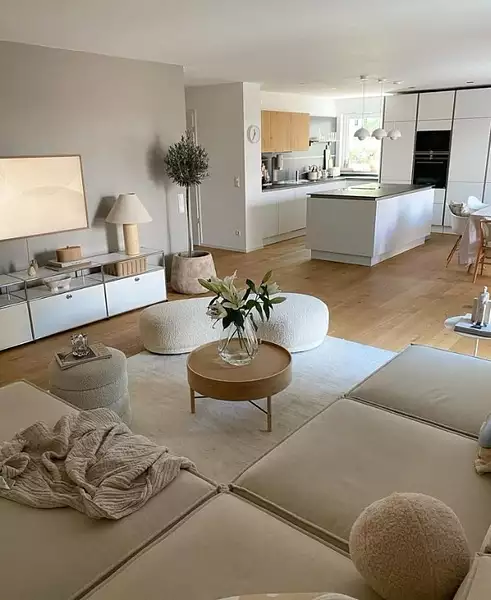 Un bel espace salon-séjour lumineux avec cuisine ouverte;