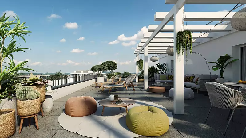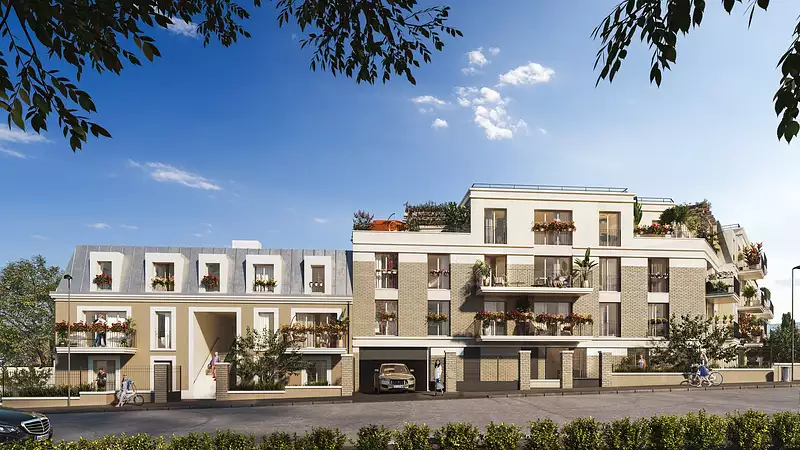 Parfaitement intégrée dans son environnement résidentiel, la réalisation se dévoile à travers une écriture classique inspirée par l'architecture du début du XXème siècle. Elle propose des immeubles de faible hauteur et des maisons élégantes aux lignes épurées. Dans un esprit de grandes villas, les façades blanches sont ponctuées de pilastres en parement de briques beiges et s'animent d'un jeu subtil d'avancées et de retraits. Les volumes savamment orchestrés libèrent de superbes terrasses plein ciel. Les garde-corps en serrurerie anthracite finement ouvragée et l'alternance des toitures à la Mansart et des toits terrasses apportent à l'ensemble un indéniable cachet.