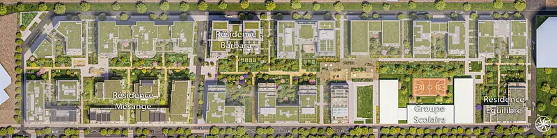 Au coeur du quartier Parcs en Scène, profitez d'un environnement verdoyant avec 40 % d'espaces verts, écoles, crèches, commerces et mobilités douces.