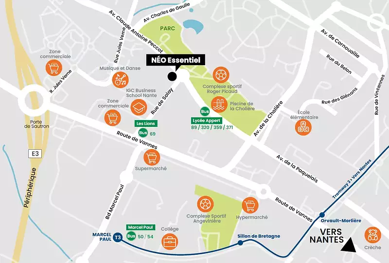 Le long de la route de Vannes, au coeur d'un ensemble de plusieurs bâtiments d'une grande variété architecturale, se trouve le futur poumon vert du quartier Néo à Orvault, où la nature s'illustre pleinement créant ainsi des zones de détente, de rencontre ou de jeux. Répondant parfaitement aux aspirations actuelles, les circulations douces ont pris le pas sur la voiture au travers de cheminements piétonniers et de pistes cyclables.Un large choix d'appartements, du 2 au 4 pièces s'offre à vous, tous prolongés par un balcon, un jardin privatif ou une magnifique terrasse aux vues exceptionnelles. Leurs surfaces intérieures profitent d'un maximum d'ensoleillement grâce à leurs orientations optimisées.