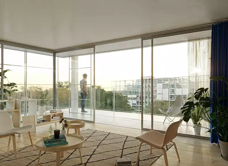 La surélévation contemporaine, légère et transparente, accueille des logements prolongés par de véritables espaces extérieurs : jardins d’hiver, balcons ou terrasses. Ces prolongements offrent une relation privilégiée avec le ciel et le paysage, et permettent de vivre dedans-dehors au fil des saisons, dans un cadre rare à Paris.