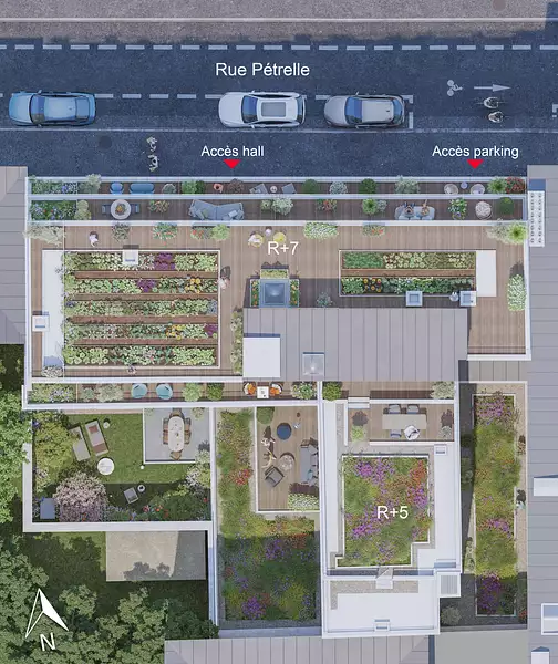 Le projet prévoit la création de trois vastes jardins auxquels s’ajoute la reconversion de la toiture-terrasse en un espace vert partagé collaboratif offrant une vue exceptionnelle sur le Sacré Coeur.