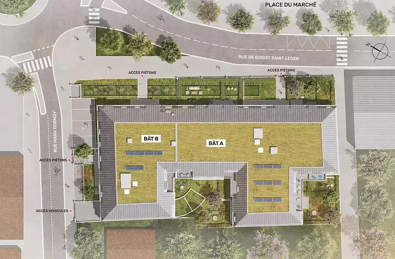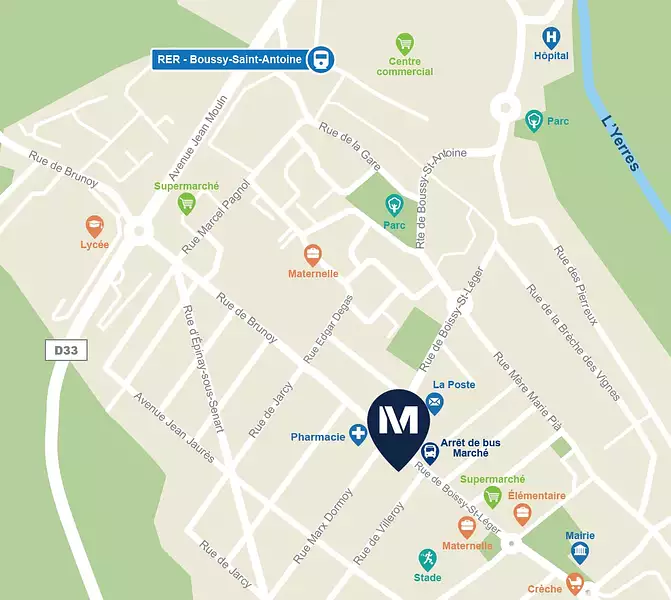 Notre résidence, idéalement située en plein cœur de la ville, bénéficie d’une position stratégique à proximité immédiate des commerces et services pour le quotidien. En face de la résidence, se trouve le marché municipal, une pharmacie, des restaurants et la banque postale. Pour une offre plus variée, le centre commercial Val d’Yerres se situe à seulement 4 min* en voiture. Les démarches administratives sont également facilitées grâce à la proximité de la mairie, située à 7 min* à pied.
