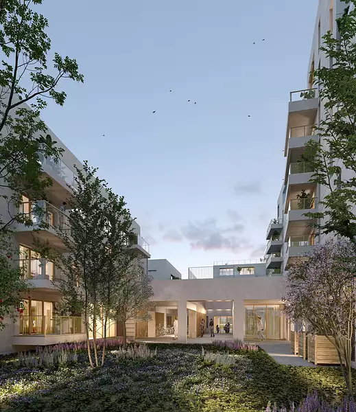 L'architecture des Dunes s'inspire du caractère urbain et dynamique du quartier. Le long de la rue de Lorient, une silhouette découpée maximise l'ensoleillement du cœur d'îlot, tandis que des matériaux nobles et durables assurent un esthétisme intemporel. Les façades vitrées sont habillées d'un béton beige lasuré, et les balcons sont dotés de garde-corps en verre et de menuiseries en aluminium beige, apportant élégance et modernité.