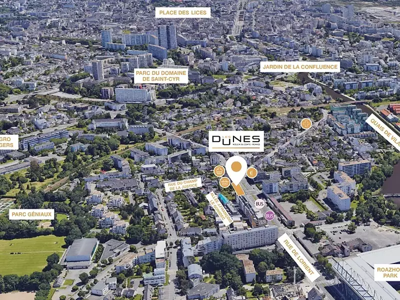 Découvrez Les Dunes, une résidence lumineuse et chaleureuse à l'esprit plein sud, idéalement située au 84-86 rue de Lorient à Rennes. Proche des quais de la Vilaine, elle bénéficie d'un accès direct à la rocade et d'une connexion rapide au centre-ville. Un emplacement parfait pour habiter ou investir dans un cadre urbain dynamique.