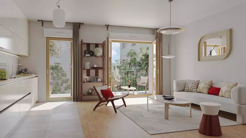La pièce de vie se compose d’un séjour avec cuisine ouverte, lumineux et aux volumes confortables. Elle donne accès à un balcon de 15,25 m², accessible depuis le séjour et l’une des chambres.