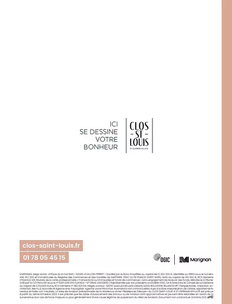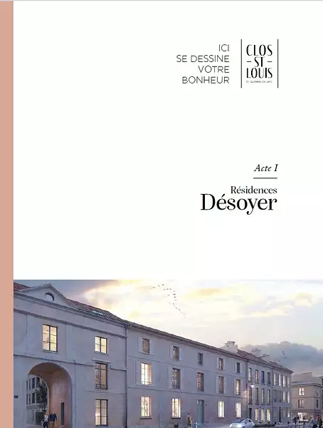 Frais de notaire offerts : Offre valable uniquement en cas de signature, du 15/01/2026 et 28/02/2026, d'un contrat de réservation portant sur le programme « Clos Saint Louis » à Saint Germain en Laye, et sous réserve de la signature d'un acte authentique de vente dans les délais stipulés au contrat de réservation. Offre limitée à 5 réservations sur la tranche tranche 1 "Acte I - Résidences Desoyer – ilot 6 et 7". Les frais de notaire ne comprennent pas les frais bancaires et de financement, les frais de garanties, les frais d’hypothèque, ni les frais liés à l'établissement du règlement de copropriété ou le cas échéant des statuts de l'Association syndicale libre ou du cahier des charges devant être versés par l'acquéreur au jour de la signature de l'acte authentique de vente et restant à sa charge. Offre cumulable non cumulable avec d'autres promotions passées, en cours et à venir.