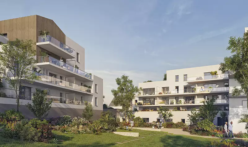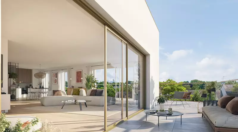 Belle signature architecturale au caractère contemporain et élégant. Résidence conçue avec des matériaux nobles : revêtements béton blanc matricé et lisse, parement pierre naturel et zinc en attique. Les façades sont élégantes et pérennes animées de balcons filants.
