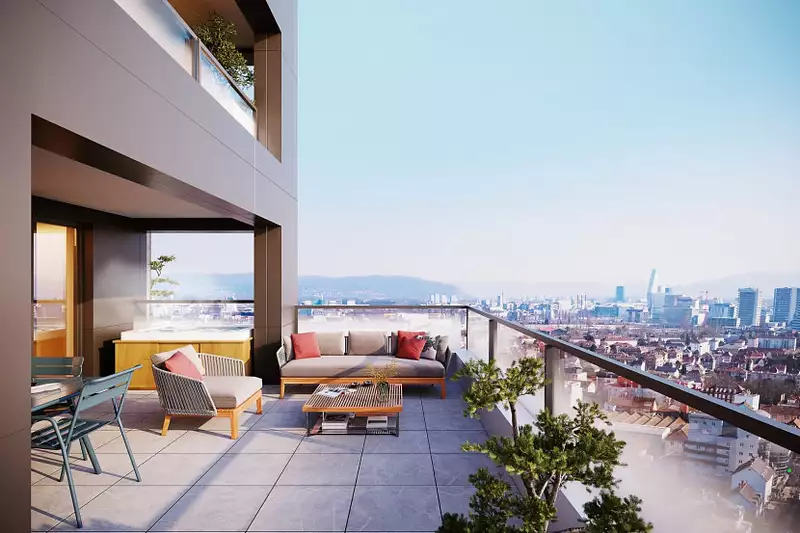 Ce bâtiment de 17 étages, tel un signal au coeur de la ville, offre à ses résidents une vue dégagée à 360 degrés jusqu'aux reliefs vosgiens, alpins, ainsi que sur les contreforts de la Forêt Noire.