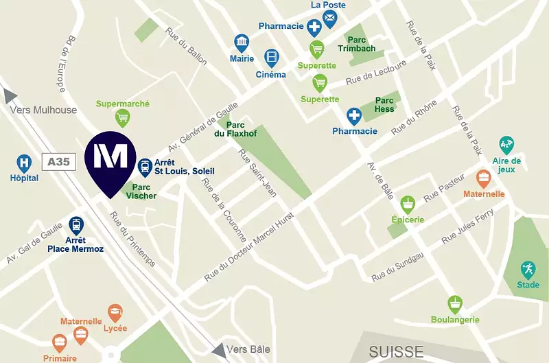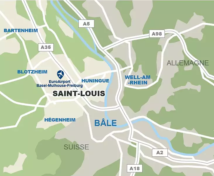 Saint-Louis allie le charme d'une petite ville conviviale et les équipements d’une grande agglomération grâce à sa proximité avec Bâle et Mulhouse. La ville se distingue par une accessibilité exceptionnelle, rendue possible par ses infrastructures modernes et bien connectées. La gare de Saint-Louis, située à 5 minutes* en voiture, offre des liaisons rapides et efficaces vers les grandes villes voisines : Bâle en 5 min*, Mulhouse en 30 min* et Strasbourg en 1h20. À cela s'ajoute la proximité immédiate de l'aéroport international de Bâle-Mulhouse-Fribourg, un véritable atout pour les voyageurs et les professionnels.