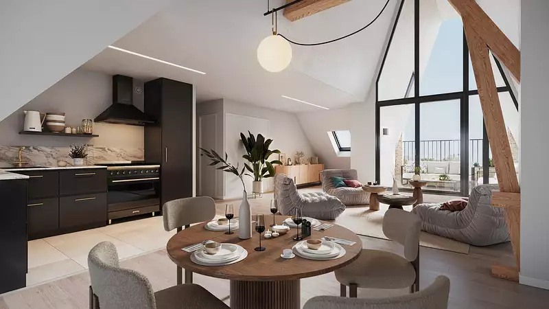 L’architecture s’inspire du patrimoine malouin tout en intégrant des matériaux nobles : brique, ardoise, métal et verre. Chaque détail a été pensé pour conjuguer élégance, confort et pérennité.