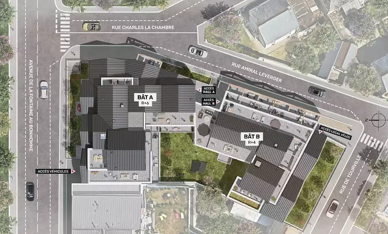 À l’intérieur, les prestations sont soignées : accès sécurisés, interphone, hall aménagé, ascenseur, local vélos et parkings en sous-sol.