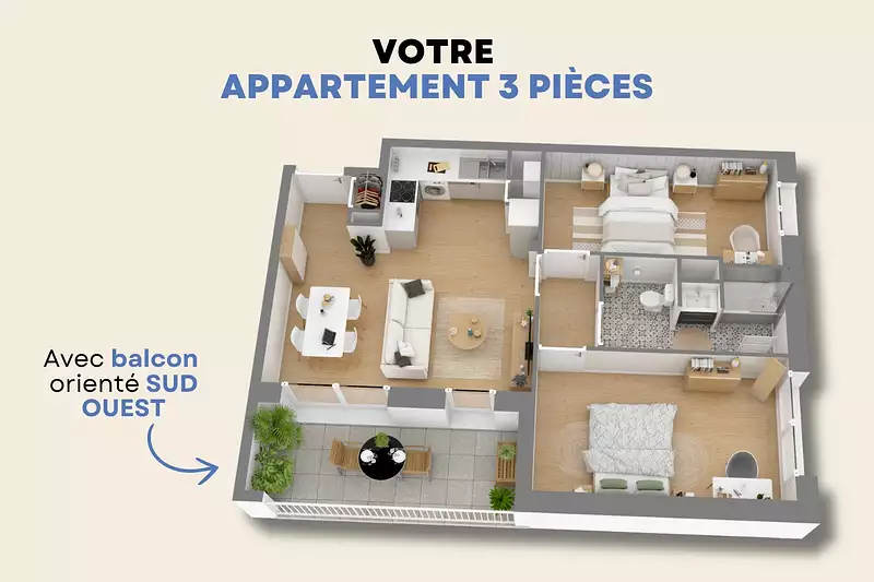 Appartements T3 : Jusqu'à 63 m² avec balcon jusqu'à 14 m², belle pièce de vie donnant sur l'extérieur, 1 salle de bains équipée, 2 chambres et 1 ou 2 places de parking (selon le lot).