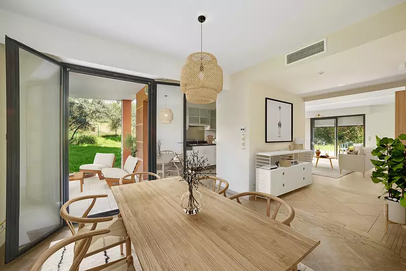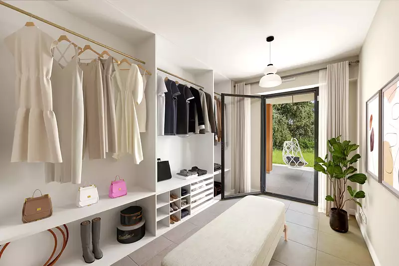 Le premier, un 5 pièces de 130 m² en rez-de-jardin, comprend trois chambres parentales avec salle d'eau et rangements, un bureau, une cuisine équipée ouverte sur la salle à manger, un séjour lumineux prolongé par une terrasse de 100 m² et un jardin privatif de plus de 1 000 m² avec piscine et garage en sous-sol avec accès direct.