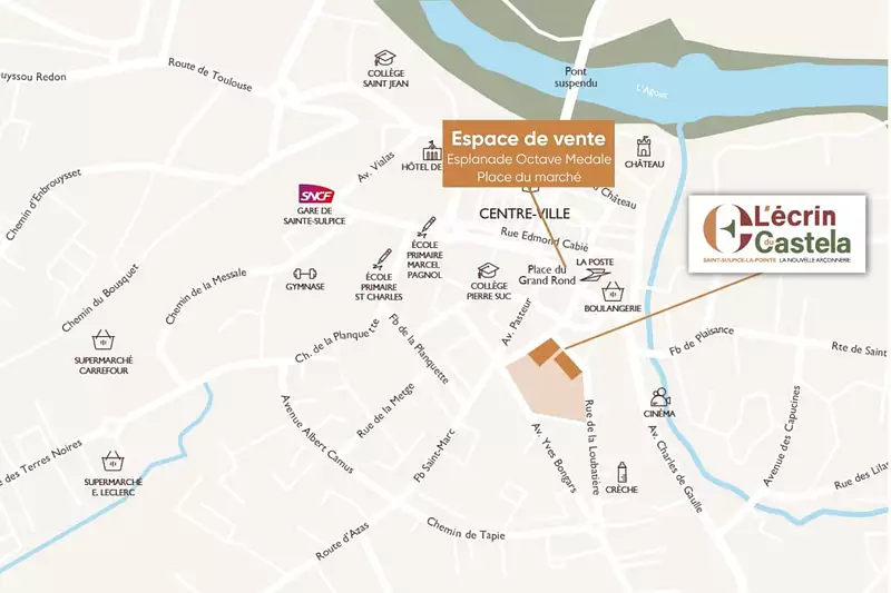 L’Écrin du Castela bénéficie d’un emplacement central, à proximité immédiate de tous les commerces, écoles, services et infrastructures. L’architecture élégante et sobre, en harmonie avec le style local, s’intègre parfaitement dans le paysage de la ville. La gare TER de Saint-Sulpice est accessible à pied, permettant de rejoindre Toulouse en seulement 20 minutes, un atout majeur pour les actifs.