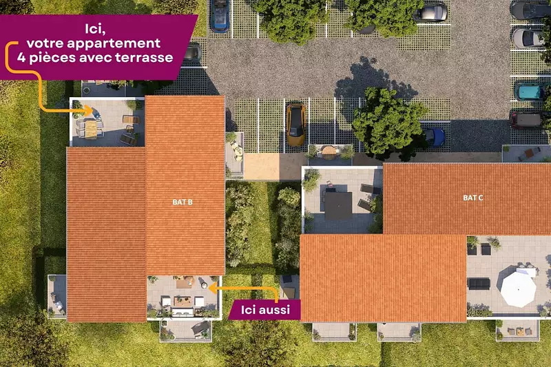 Derniers T4 : entre 84 et 86 m² - 1 ou 2 parking - 1 jardin ou 1 terrasse - WC séparé - 1 ou 2 salles de bain équipées - pièce de vie lumineuse ouverte sur l'extérieur