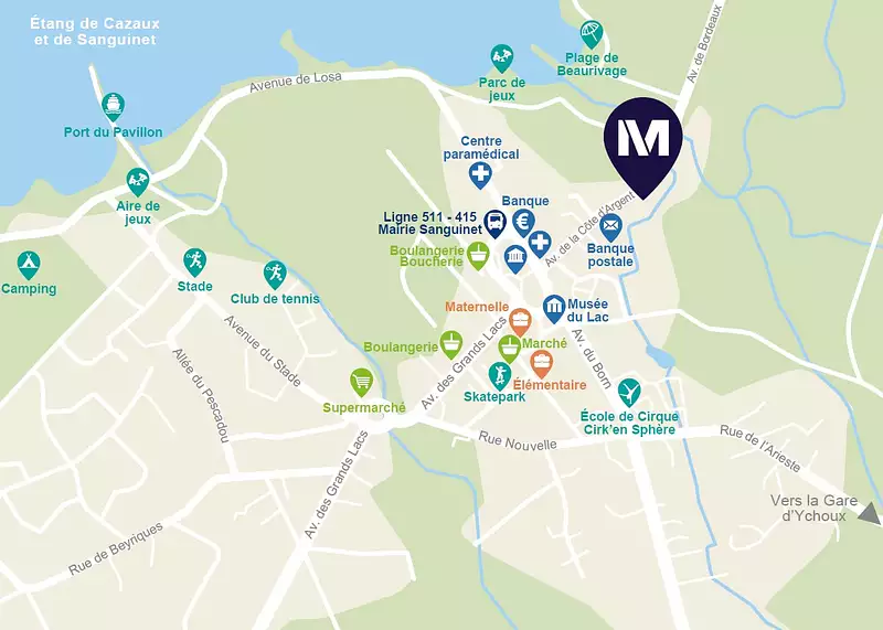 Située au cœur de Sanguinet, la résidence bénéficie d'un environnement dynamique et pratique : commerces de proximité, nouvelle école en cours de construction et accès rapide à l'autoroute vers le bassin d'Arcachon et Bordeaux.