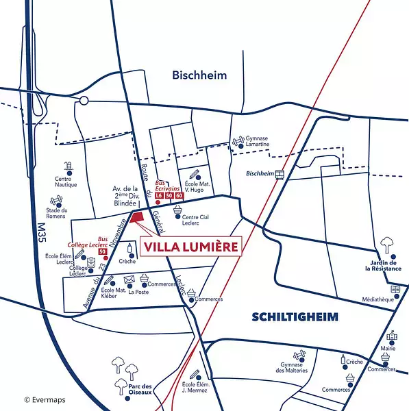 • Bus lignes 50, 60 et L6 station « Écrivains » à 2 minutes à pied*.