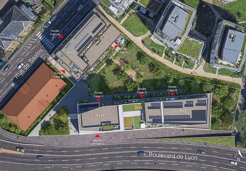 La résidence s’organise autour d’un cœur d’îlot végétalisé: des arbres, des cheminements, un espace extérieur calme en pleine ville. Un vrai lieu pour faire une pause, respirer, prendre le temps.