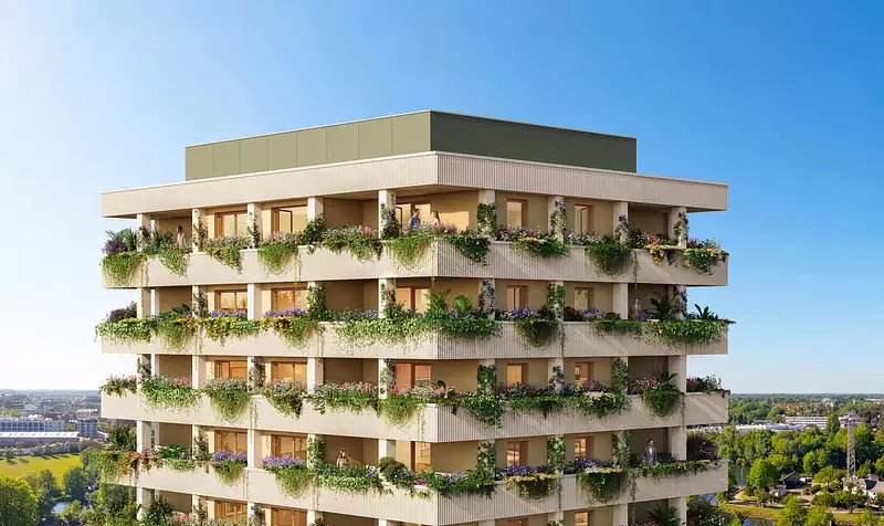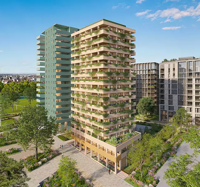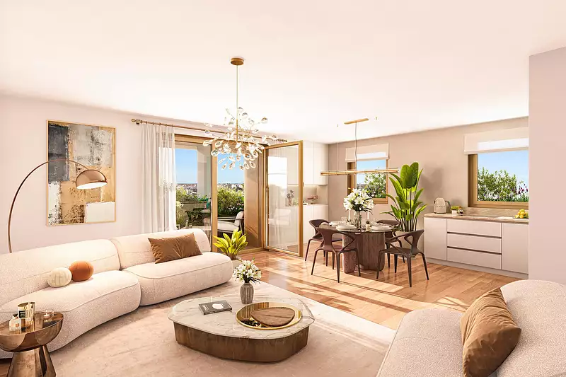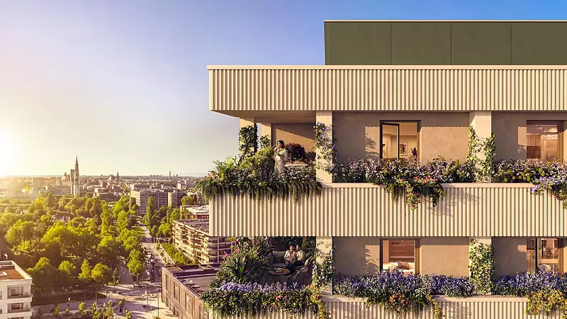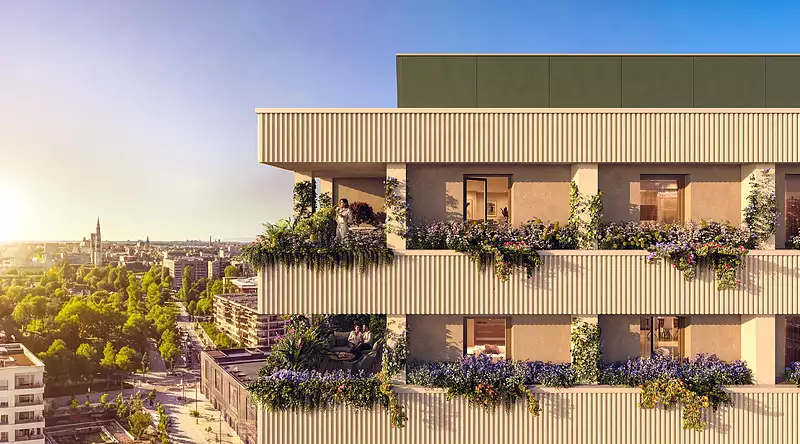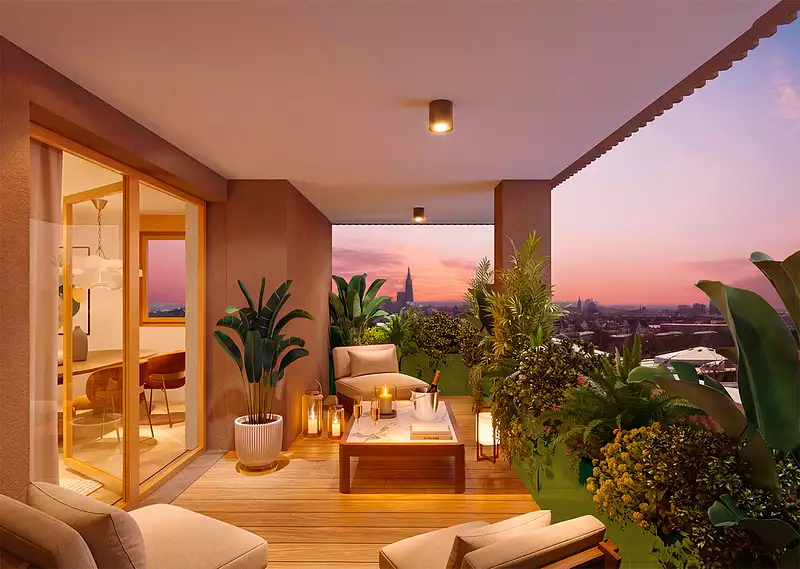 Les appartements s’ouvrent sur des loggias intégrées à l’architecture, pensées comme de véritables prolongements du séjour. Végétalisées et protégées, elles participent au confort thermique, filtrent la lumière et créent une transition douce entre intérieur et extérieur. Depuis ces espaces privilégiés, les vues se déploient vers le grand paysage : la cathédrale de Strasbourg, les reliefs vosgiens, la Forêt-Noire au loin.