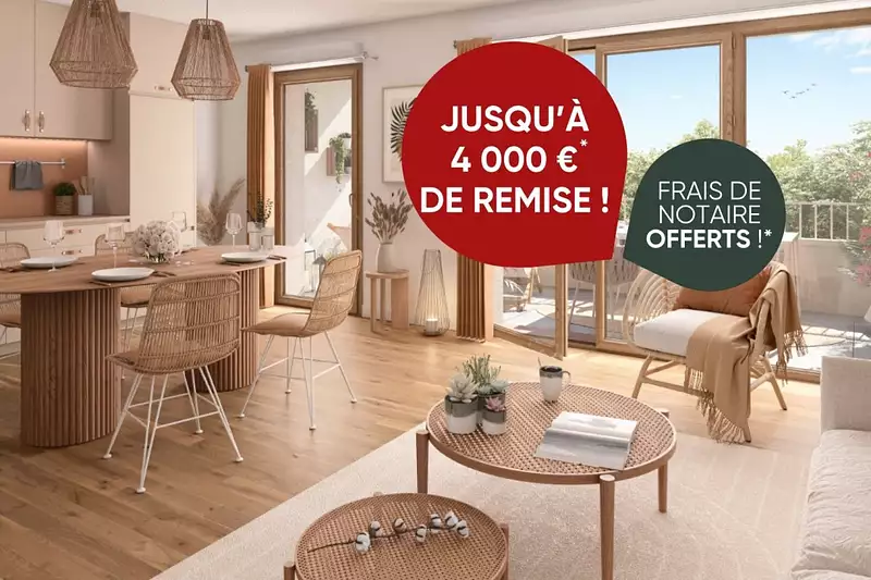 *Frais de notaire offerts + Remise de 1 000€ TTC par pièce principale soit 2 000€ pour un T2, 3 000€ pour un T3 et 4 000€. Offre valable pour les 5 prochains réservataires, sous conditions de la signature d'un contrat de réservation jusqu'au 31/03/2026 et à la réitération de l’acte authentique de vente dans les 3 mois qui suivent la réservation.