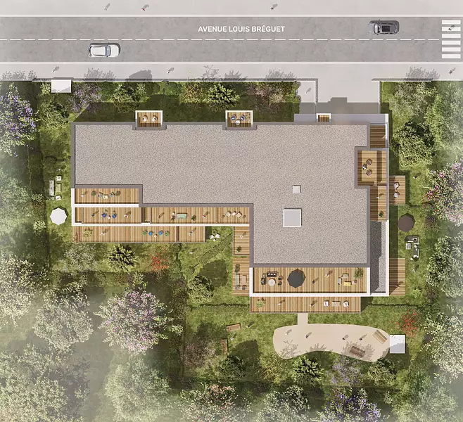 Chaque logement bénéficie d’espaces extérieurs généreux et de larges ouvertures favorisant l’apport de lumière naturelle. À l’arrière de la résidence, un espace vert commun vient compléter l’ensemble, offrant aux résidents un lieu de convivialité propice à la détente et au partage.