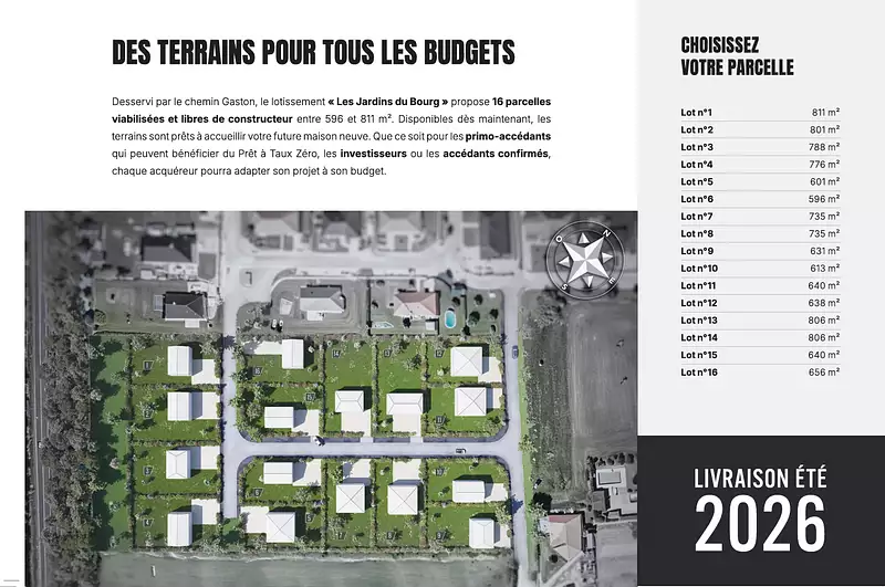 NOUVEL HABITAT vous propose 16 terrains à bâtir, viabilisés et libres de constructeur dans un bel environnement calme et verdoyant, allant de 596 m² à 811 m², afin de s'adapter à tous les projets et à tous les budgets.