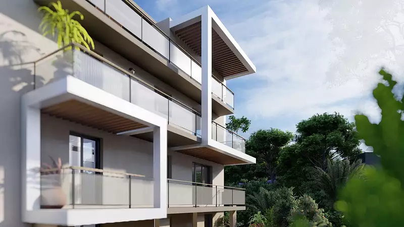 L'architecture, repensée avec des matériaux nobles, s'intègre harmonieusement au paysage côtier. La pierre naturelle en rez-de-chaussée, les larges terrasses, les balcons et les grandes baies vitrées ouvrent les espaces de vie vers l'horizon, tout en préservant l'intimité des résidents.