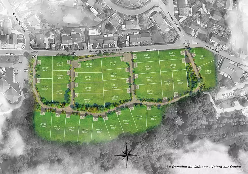 À moins de 10 minutes de Dijon, « Le Domaine du Château » vous propose un cadre de vie rare et privilégié, sur l'ancien parc du château de Velars-sur-Ouche. Cette opération comprend 32 terrains à bâtir, libres de constructeur, dont les surfaces varient de 432 à 838 m , à partir de 111 180 TTC. Les terrains sont entièrement viabilisés, avec des frais de notaire réduits à 2,5 %, et offrent la possibilité d'installer piscines et toitures. Garantie d'un quartier l'harmonieux. L'aménagement du site prévoit une voirie à sens unique pensée comme une allée de parc, des stationnements privatifs, des espaces verts, des liaisons piétonnes vers le village et le bois classé, ainsi qu'un rideau végétal en limite ouest. Les études de sol sont fournies, et les terrains sont livrables immédiatement.