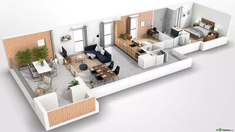 Les appartements, livrés à l'été 2025, offrent des prestations haut de gamme telles que les menuiseries en bois, des brise-soleil orientables motorisés et sont accompagnés de garages boxés en sous-sol.