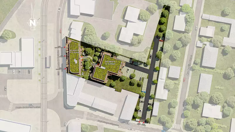 Programme conforme à la réglementation RE 2020 seuil 2025, avec toiture végétalisée, chauffage collectif et stationnements paysagers favorisant la mobilité douce.