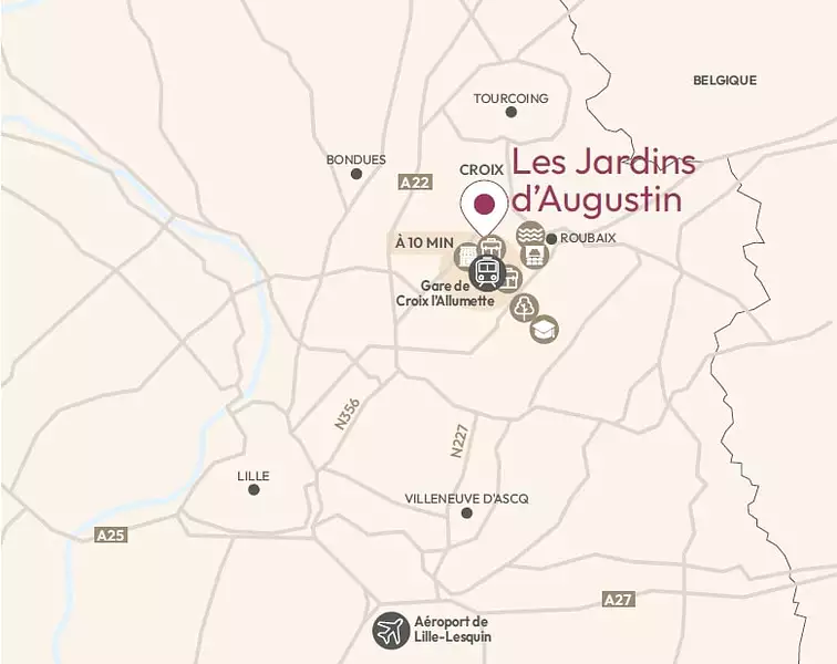 À seulement 10 minutes à pied, retrouvez écoles, boulangerie, supermarché et la gare de Croix l’Allumette, qui relie Lille Flandres en 10 minutes. Le pôle d’innovation Plaine Image est accessible en 5 minutes à vélo, tandis que le centre-ville de Croix, le parc Barbieux, le Colisée, le centre aquatique Thalassa et le campus de l'EDHEC sont à moins de 10 minutes en voiture. Euralille est à 15 minutes, parfait pour profiter de la métropole lilloise.