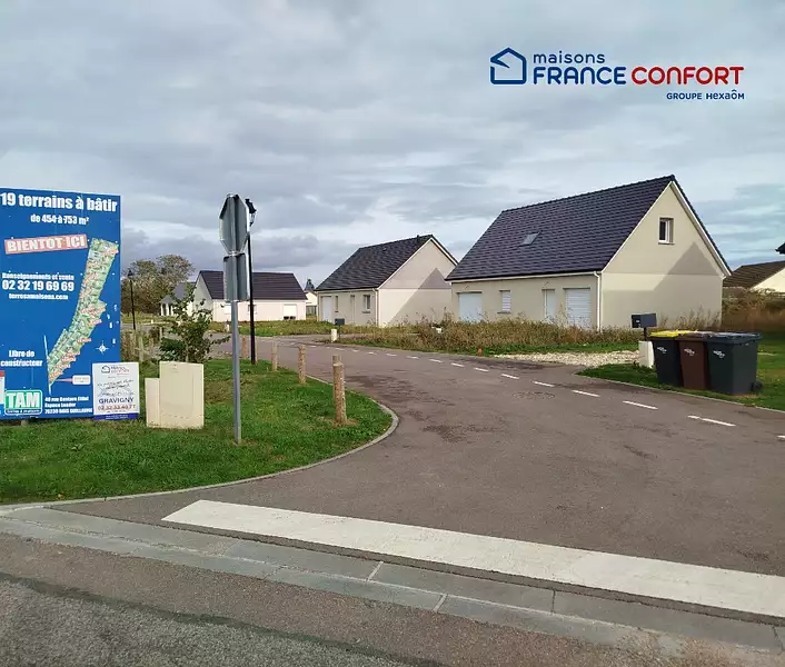 Terrain proposé par un partenaire foncier selon disponibilités et autorisation de publicité et sélectionné par le constructeur en vue de construire une maison neuve avec un contrat de construction de maison individuelle, dans le cadre de la loi du 10/12/1990. Assurances et garanties du constructeur (RC professionnelle, décennale, dommage ouvrage, garantie de remboursement de l'acompte, livraison à prix et délai convenu) : https://www.maisons-france-confort.fr/mentions-legales/. HEXAOM Services est enregistré auprès de l'ORIAS en tant que Courtier en financement, Niveau 1, sous le numéro 14001345.