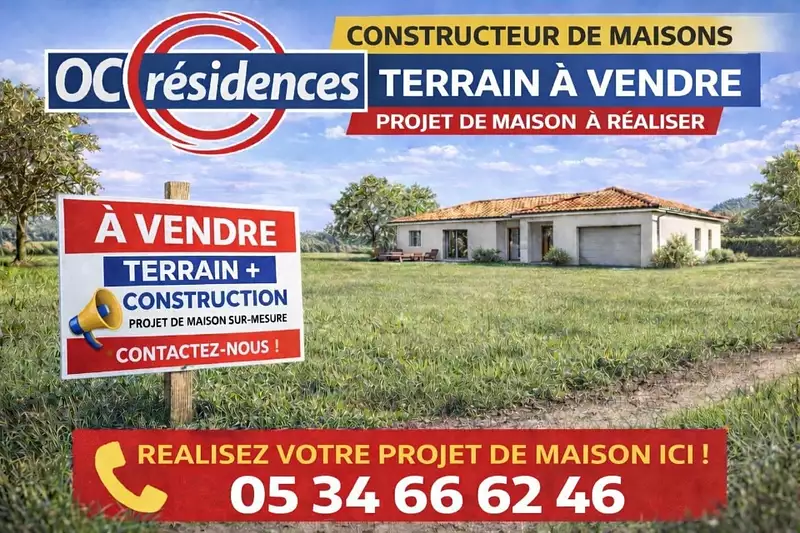 Terrain proposé par un partenaire foncier selon disponibilités et autorisation de publicité et sélectionné par le constructeur en vue de construire une maison neuve avec un contrat de construction de maison individuelle, dans le cadre de la loi du 10/12/1990. Assurances et garanties du constructeur (RC professionnelle, décennale, dommage ouvrage, garantie de remboursement de l'acompte, livraison à prix et délai convenu) : https://www.oc-residences.fr/mentions-legales/.